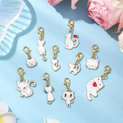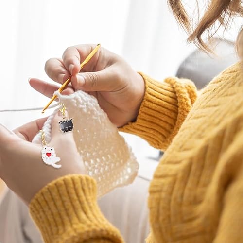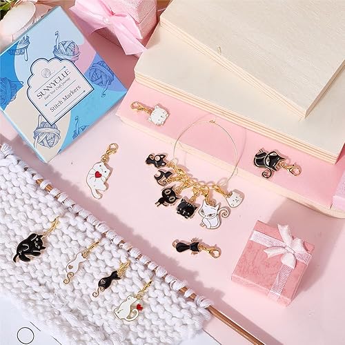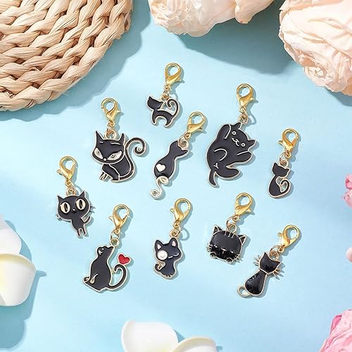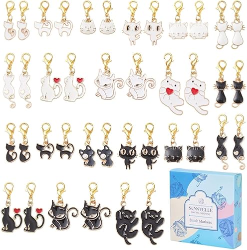 SUNNYCLUE 1 boîte de 40 marqueurs de Mailles 10 styles Breloques en Alliage Émaillé Noir et Blanc Mignon Chaton Coquette Fermoirs Mousquetons Dorés Breloques pour Tissage Tricot Crochet Bricolage Four