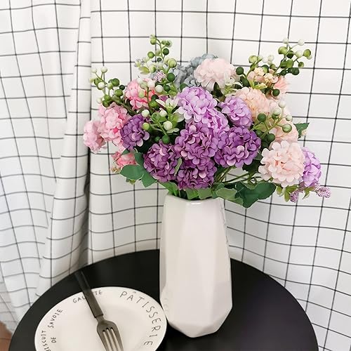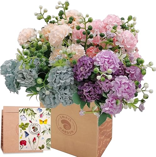 SNAIL GARDEN 40 têtes de Fleurs d'hortensia artificielles,Paquet de 4 Mini hortensias en Fausse Soie avec 1 Vase en Papier Kraft,Mini Boule de chrysanthème Artificielle,Parfaite pour Le Mariage