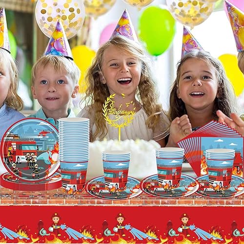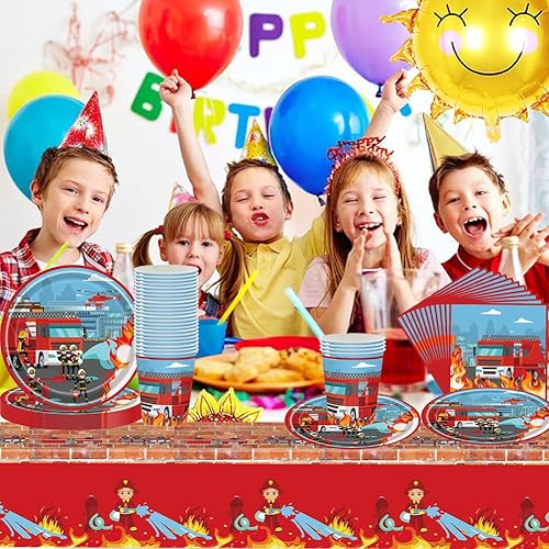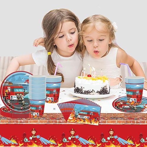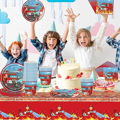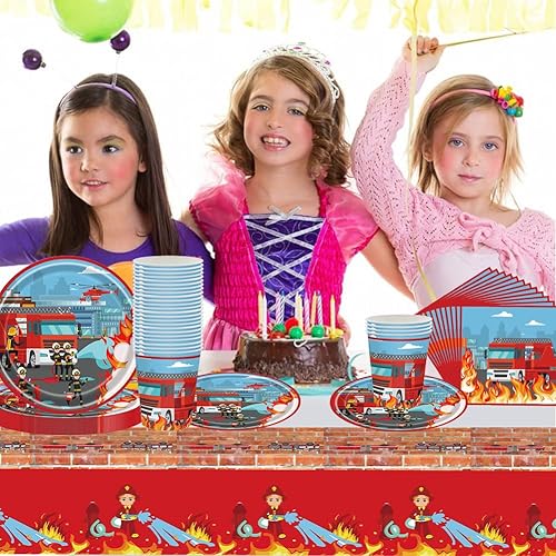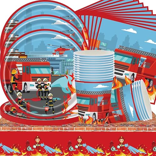 Pompier Vaisselle,Ensemble de vaisselle de pompier, pompier Vaisselle Fête, Kit Vaisselles Anniversaire Nappe, Assiettes,Serviettes et Gobelets en Papier (41PCS)