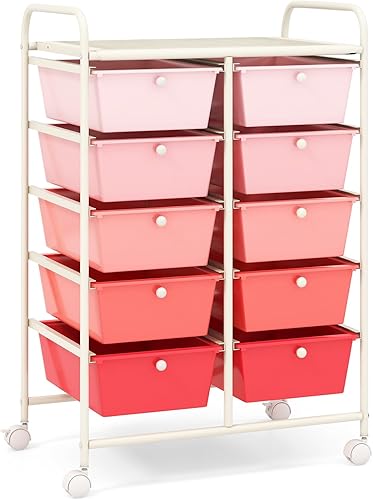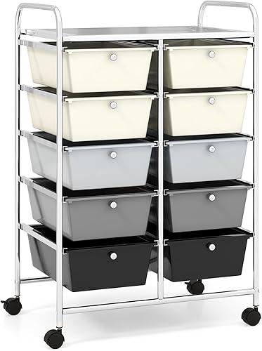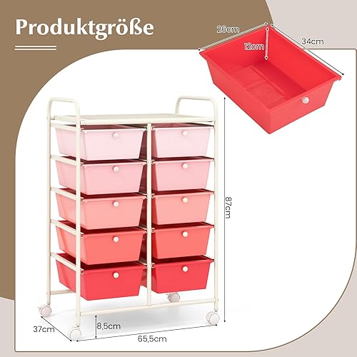 COSTWAY Chariot à roulettes avec 10 tiroirs empilables, Chariot à tiroirs avec Structure en métal et étagère, Chariot de Rangement pour Bureau, Salon, 65,5 x 37 x 87 cm