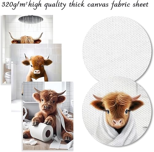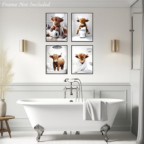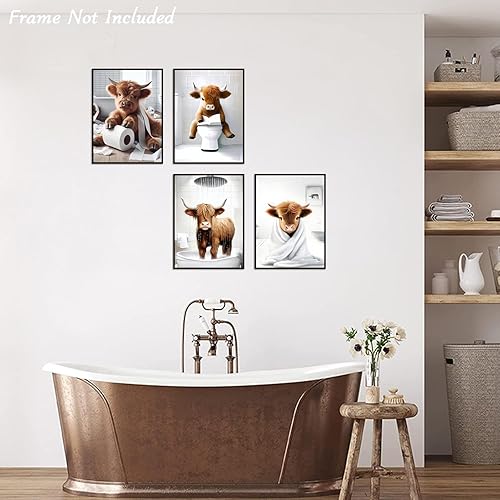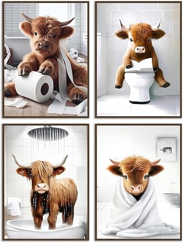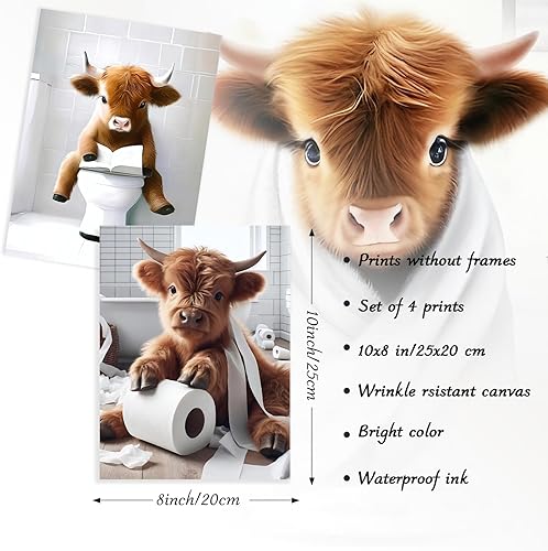 Dazzlewall Lot de 4 Posters Vaches Highlands Drôles Style Farmhouse pour Salle de Bain Toilettes 20×25 cm Non Encadrés