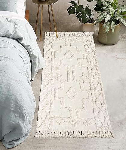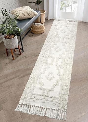JaeMoose Tapis de couloir bohème en coton lavable avec pompons - Tapis marocain tissé à la main - Pour couloir, chambre à coucher, salle de bain - Beige - 60 x 130 cm