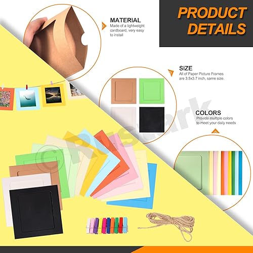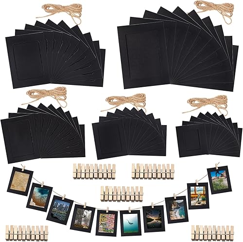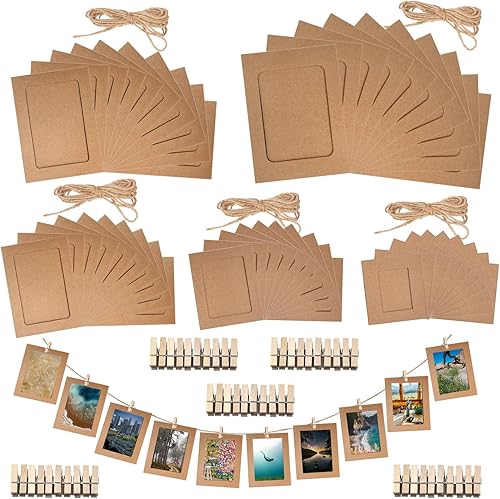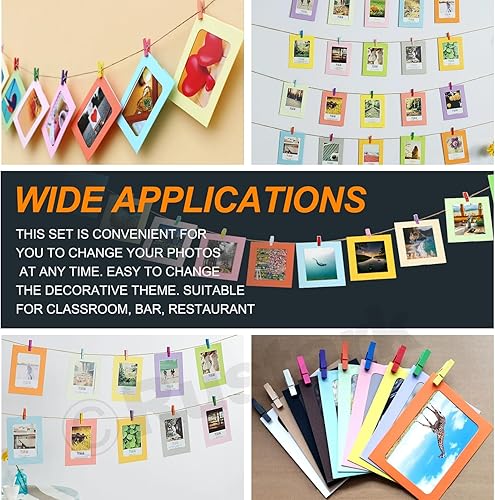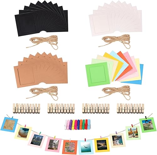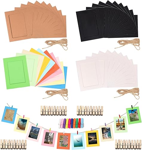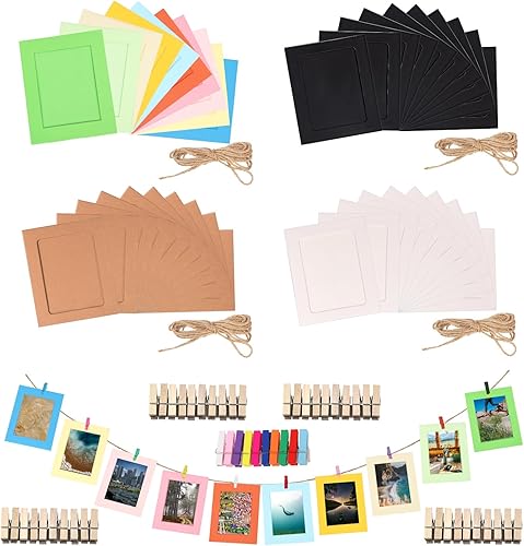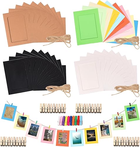 Rustark Lot de 84 cadres photo en papier de couleurs mélangées avec pinces en bois et ficelle de jute pour décoration murale 15,5 x 11,5 cm