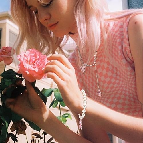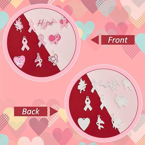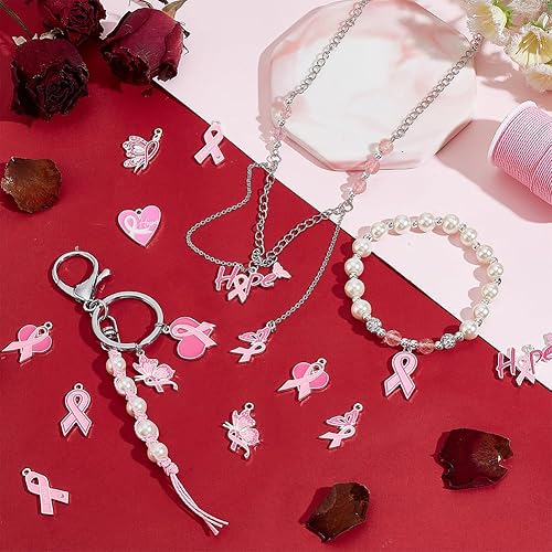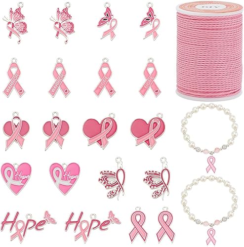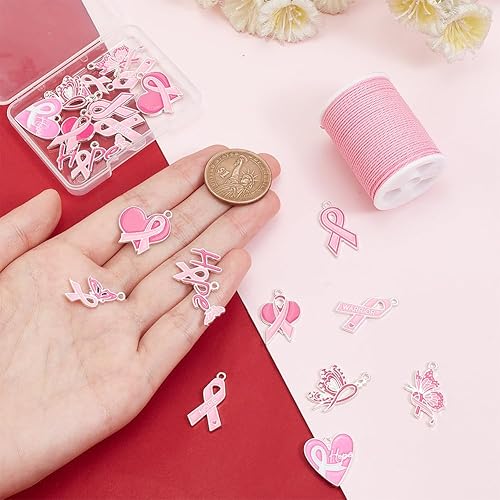 PH PandaHall 20pcs Breloques de Sensibilisation au Cancer du Sein Pendentifs en Ruban Rose Breloques de Sensibilisation au Cœur en Émail Pendentifs Papillon Espoir avec Cordon pour Bracelet Bijoux