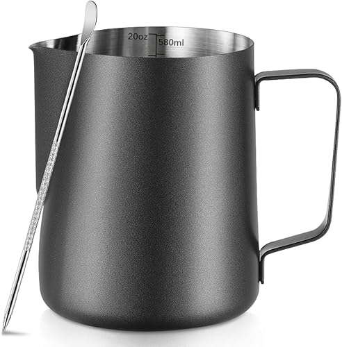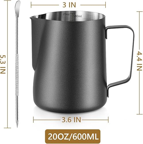Pichet à lait moussant en acier inoxydable de 600 ml avec stylo Latte Art, avec mesures internes, pour cappuccino, expresso et plus encore-Noir