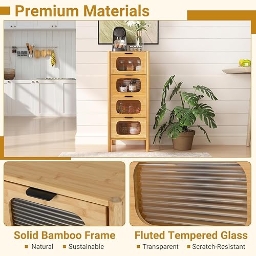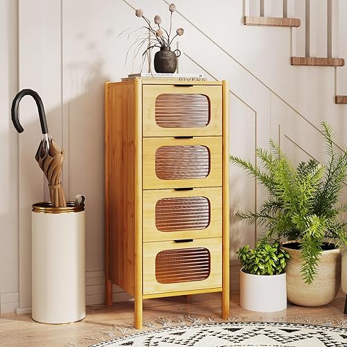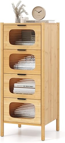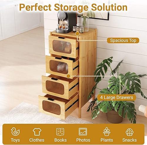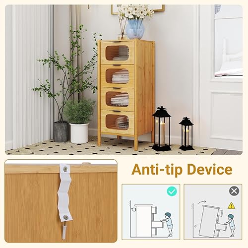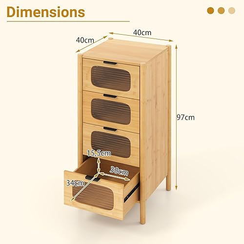 GIANTEX Commode à 4 Tiroirs 97 CM, Meuble de Rangement en Bois avec Tiroirs en Verre Trempé, Design Antibasculement, Table de Chevet à 4 Niveaux Autoportante pour Chambre, Salon, Entrée, Naturel