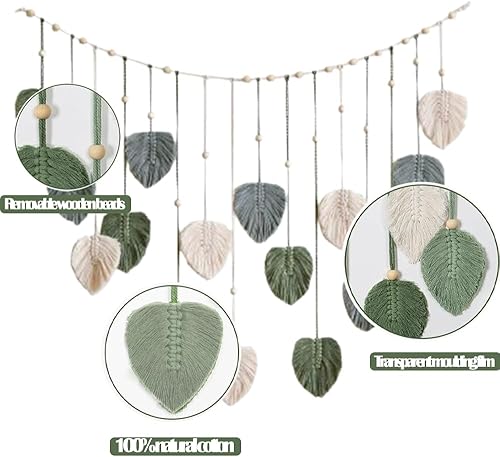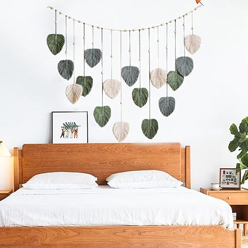 LIMEOW Tapisserie murale en macramé avec feuilles bohème, Plume Murale Décoration,En coton tissé,pour femme, Pour chambre à coucher, salon, chambre d'enfant Décoration Murale d'Appartement (vert)