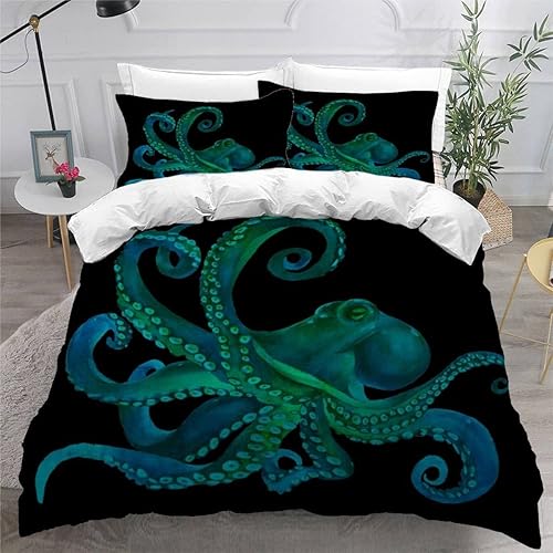 AKATIE Housse de Couette 220x240 Ado Adulte Parure de Lit Pieuvre Poulpe Bleu Océan Housse de Couette en Microfibre Hypoallergique Ensemble de Literie avec 2 Taies d'oreiller