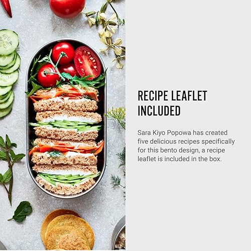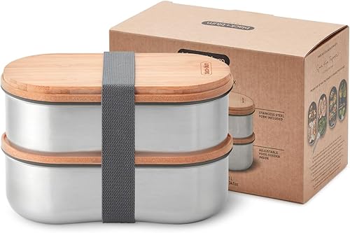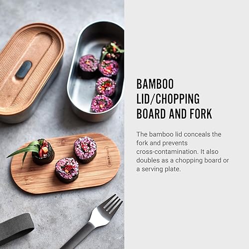 BLACK + BLUM - Bento Box Empilable - Boîtes Lunch Box en Acier Inoxydable avec Couvercle en Bambou - Hermétiques - Fourchette Comprise - 2 x 500 ml - Gris/Amande