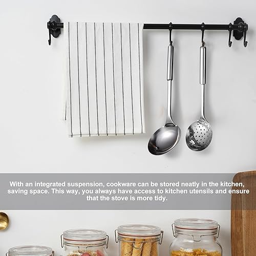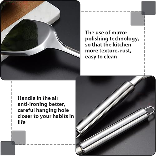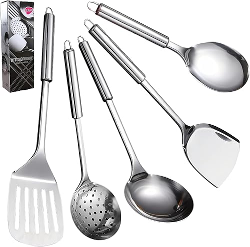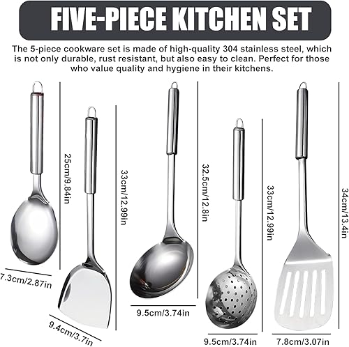 LEKEFETO Lot de 5 ustensiles de cuisine en acier inoxydable avec cuillère, louche, spatule, spatule et écumoire, avec dispositif de suspension en acier inoxydable 304, argenté