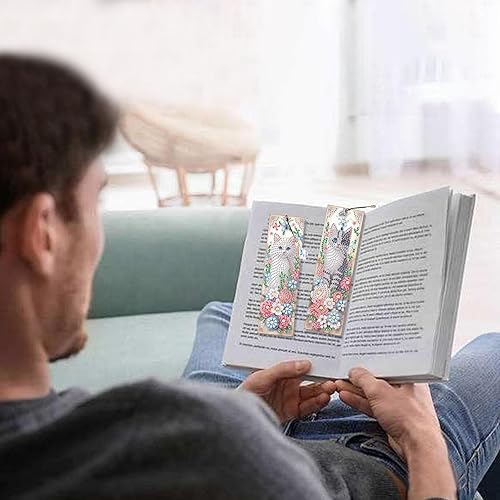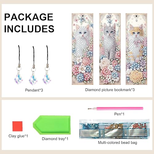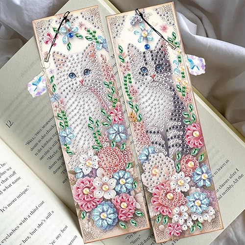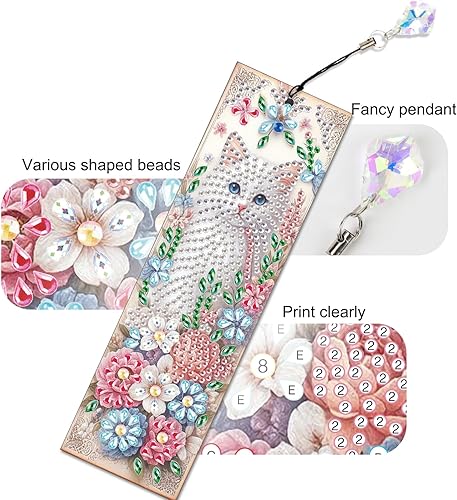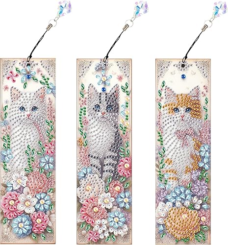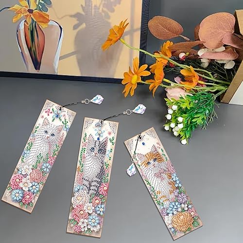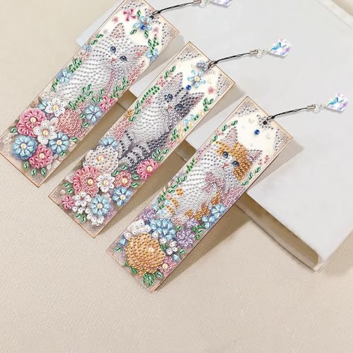 DCIDBEI 3 Pièces Diamond Painting Marque Pages Chat Fleurs Peinture diamant Marqueurs de Page Broderie Diamant Bandes de Lecture pour Enseignants des pierres à paillettes Livres Accessoires Artisanat