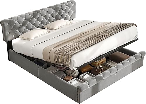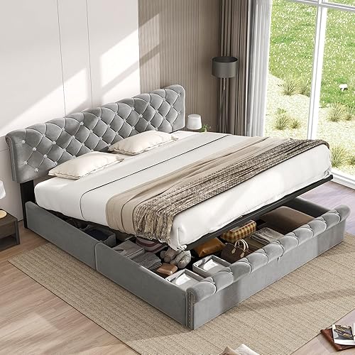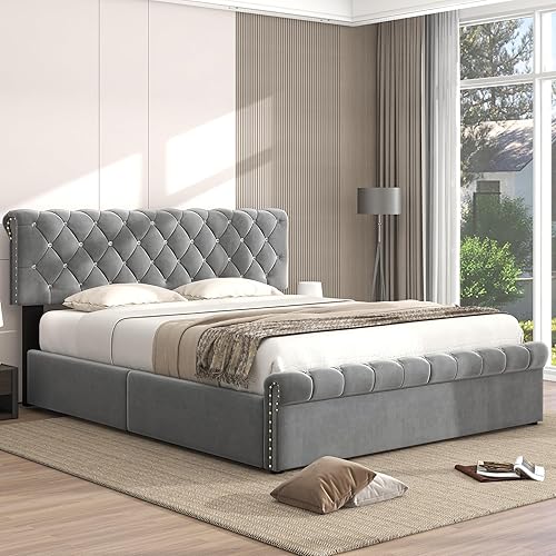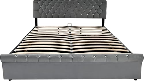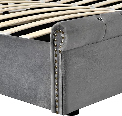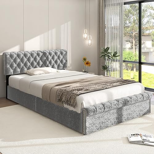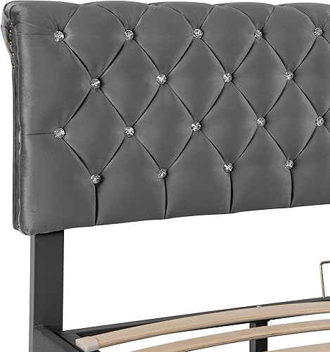 Darywell Lit capitonné, avec sommier à lattes et tête de lit, tête de lit réglable en hauteur, lattes en bois, montage facile, velours, gris, 90 x 200 cm