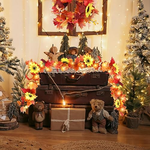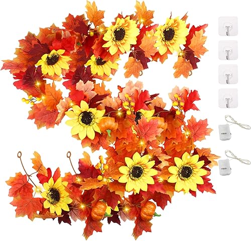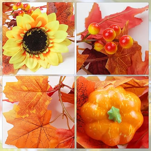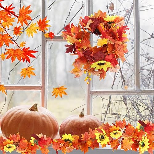 JINXIAN 2 Pièces Feuilles D'érable Vigne Artificielle Guirlande Automne avec Feuilles D'érable de Baies de Citrouille de Tournesol et 4 Crochet Deco Automne Maison