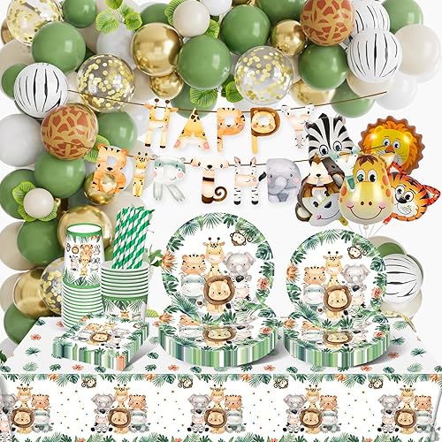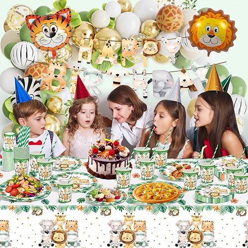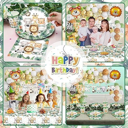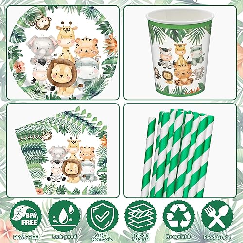 Decoration Anniversaire Animaux de la Jungle, Vaisselle jetable Anniversaire Jungle Vert, Decoration Anniversaire Jungle Papier avec Bannière d'anniversaire d'animaux,Assiettes en Papier, Serviettes