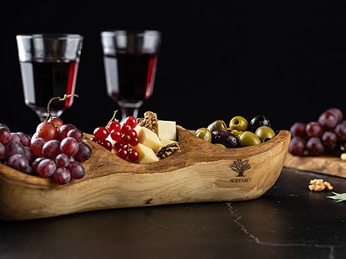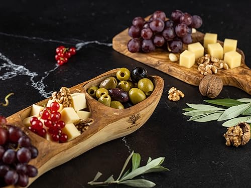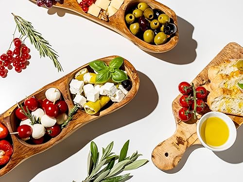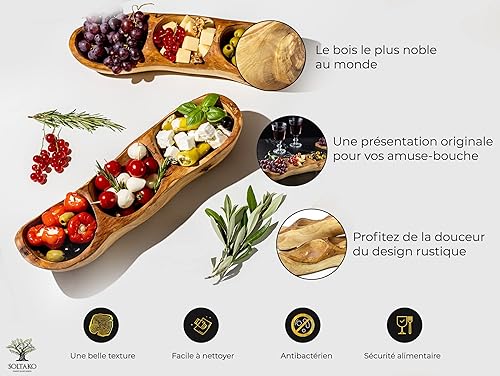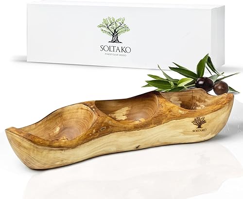 SOLTAKO Assiette Apéritif en Bois d’Olivier - Plateau Apéro à 3 Compartiments - Plat de Service - Bol en Bois Brut pour Fromages, Sauces, Charcuterie, Noix - Bol à Snack - env. 34x10cm