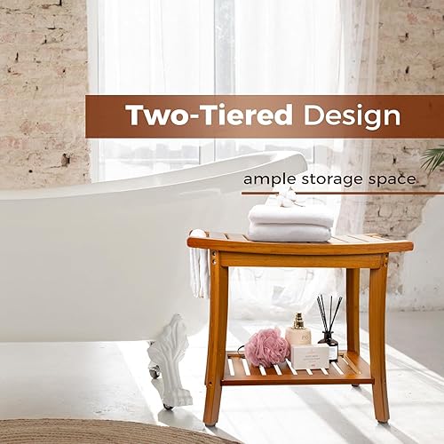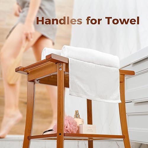 Utoplike Banc de Douche en Teck avec poignées, Tabouret de Bain Portable en Bois avec étagère de Rangement pour Serviettes, Grand Banc de Douche étanche, Parfait pour la Salle de Bain et l'extérieur