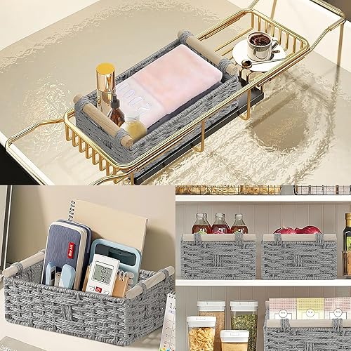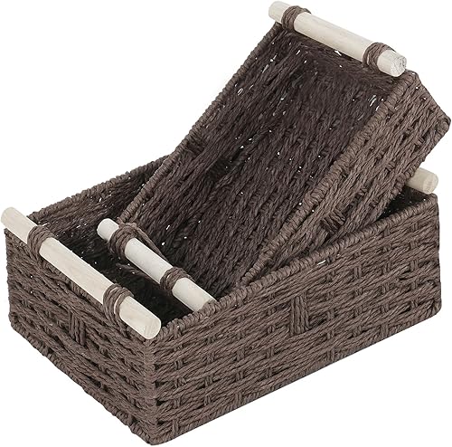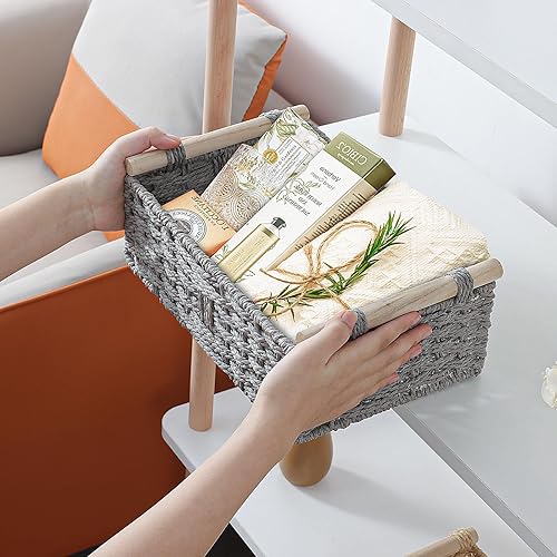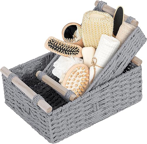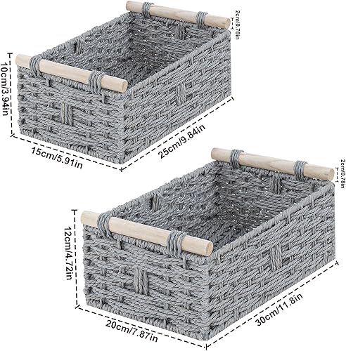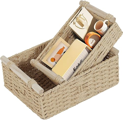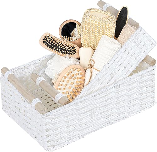 Yheenlf Boîte de Rangement, 2er Set Paniers Tressés, Petit Panier avec Poignée pour Salon, Chambre et Salle de Bain, Décor Maison, 30x20x12cm/25x15x10cm, Blanc