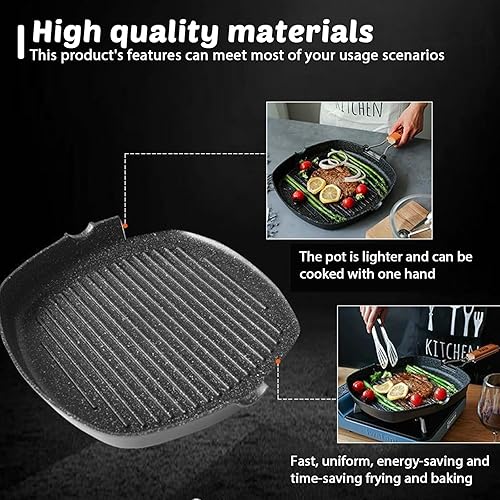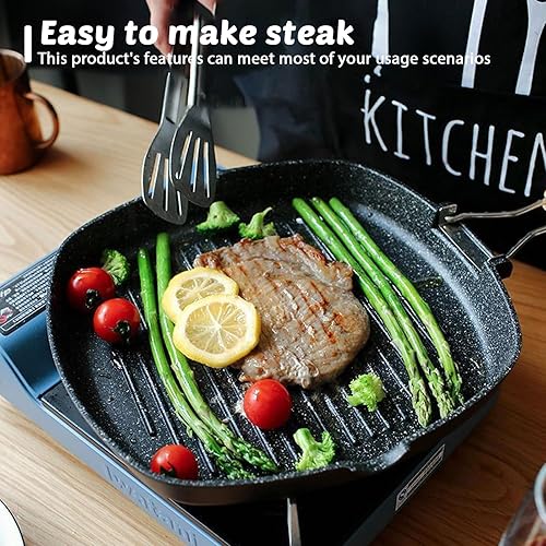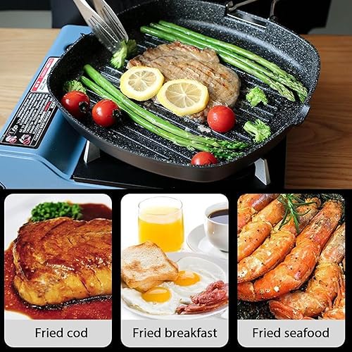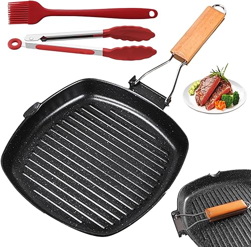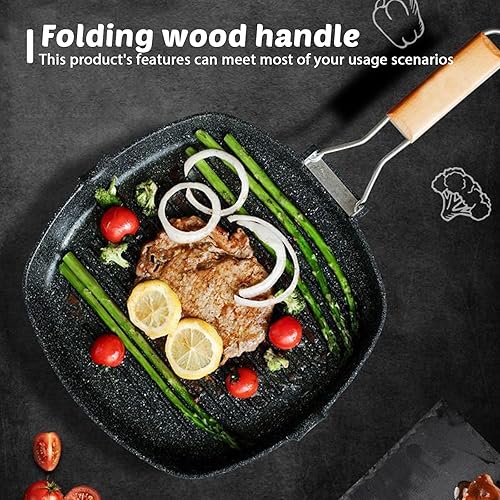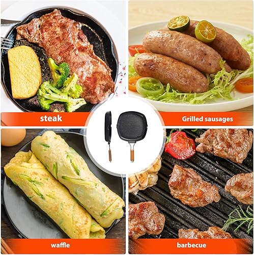 PRITOK Poêle à griller ondulée en fonte pour induction avec manche en bois pliable, poêle en fonte rectangulaire antiadhésive pour tous types de feux, 24 x 24 cm