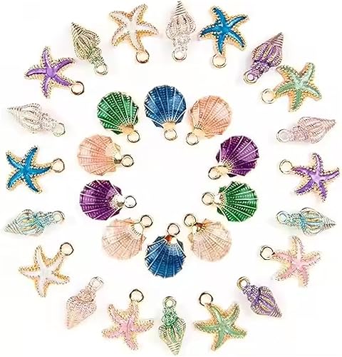 WUSJCOF 30 Pièces Breloques pour Bijoux et Bracelets DIY, Breloques Plaquées Or avec Coquillage, Émaillées en Forme de Coquille et Animaux Marins, Breloques pour Bijoux Création