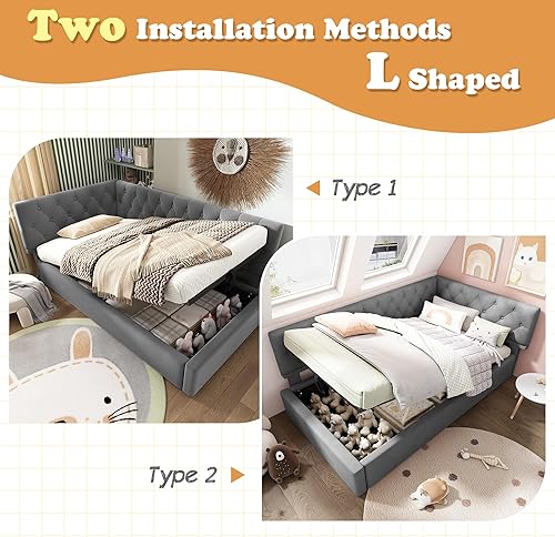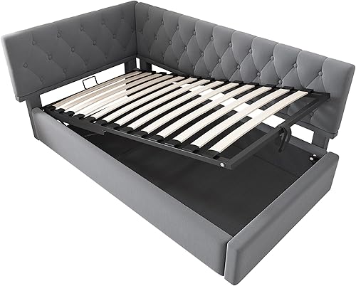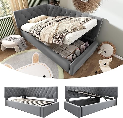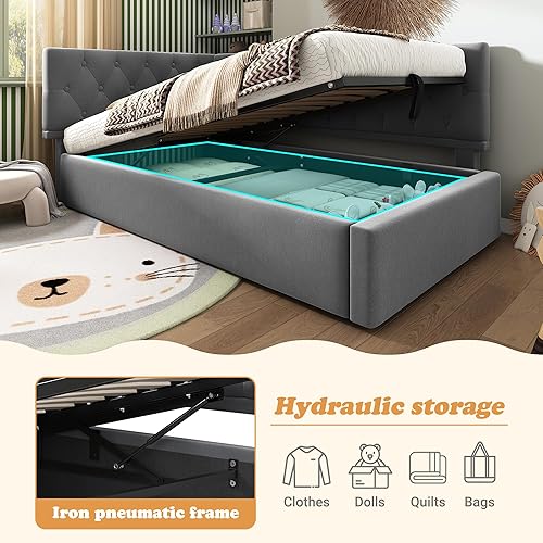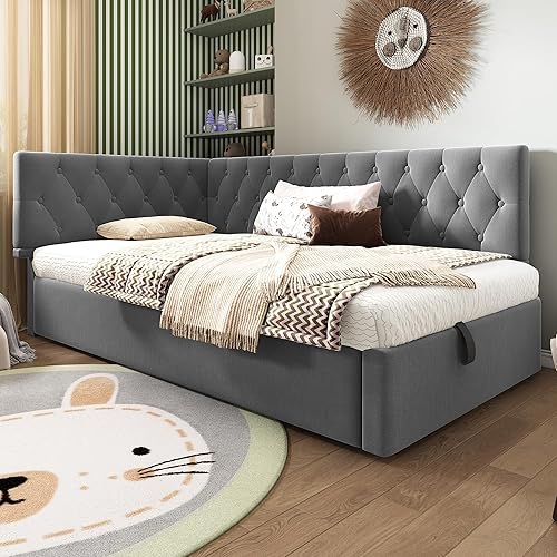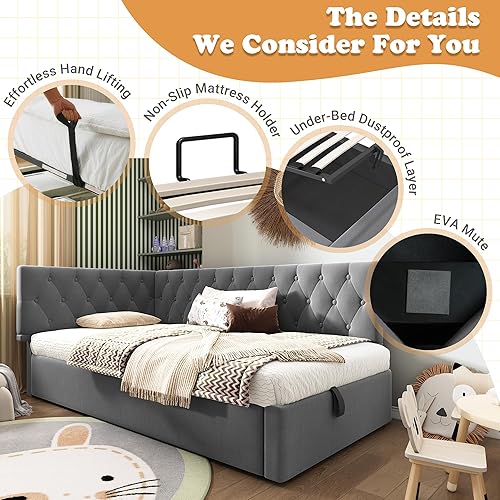 Zepneiy Lit Enfant 90x200 avec Espace de Rangement hydraulique, Canapé lit avec sommier à Lattes, Lit Rembourré Cadre de lit en Velours Beige (sans Matelas)