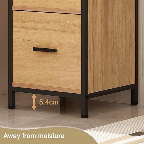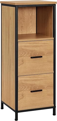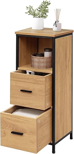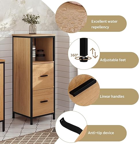 EUGAD Meuble de Salle de Bain avec 2 Tiroirs, Étagère de Rangement sur Pied, Table de Chevet avec 1 Compartiment Ouvert, Armoire d'Appoint pour Chambre, 30x30x80cm, Noir+Chêne Clair