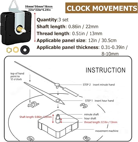 3 ensembles 22mm Arbre Mécanisme de Mouvement d'horloge avec Mains et Chiffres, Remplacement des Pièces de Réparation D'horloge Mouvement à Arbre Long à Couple Élevé avec Mains & 1 Chiffres Romains