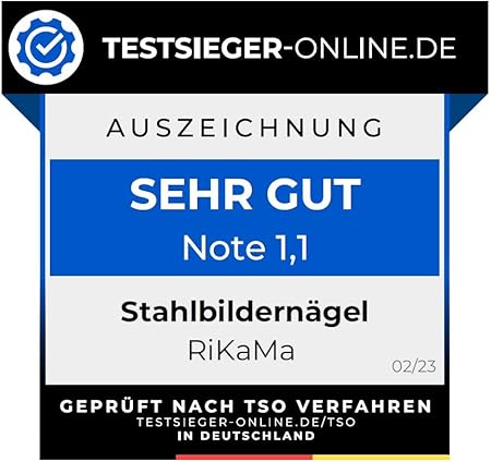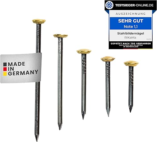 RIKAMA® - Lot de 100 clous en acier pour tableau - Pour une utilisation sur le béton, la brique, le plâtre et le bois - Clous en acier trempé comme suspension pour images - Fabriqué en Allemagne (doré