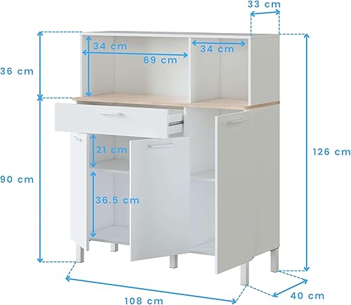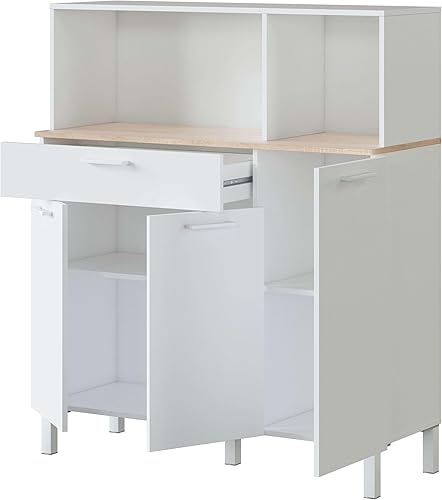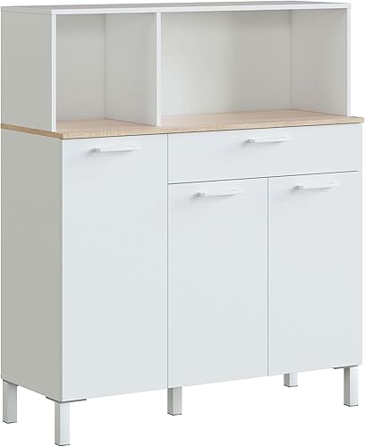 Armoire de cuisine, buffet de salle à manger, 3 portes + 1 tiroir et étagère intérieure, finition en blanc Artik et chêne canadien, mesures : 108 cm (L) x 126 cm (H) x 40 cm (P)