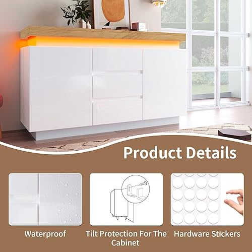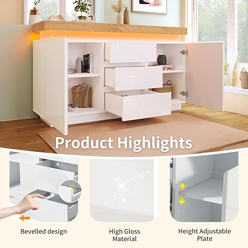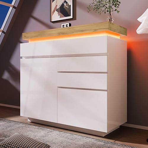KOMHTOM Commode avec 2 Portes et 3 tiroirs, Meubles de Rangement Armoire avec éclairage LED, pour Chambre à Coucher et Salon, Blanc (115 x 110 x 39 cm)