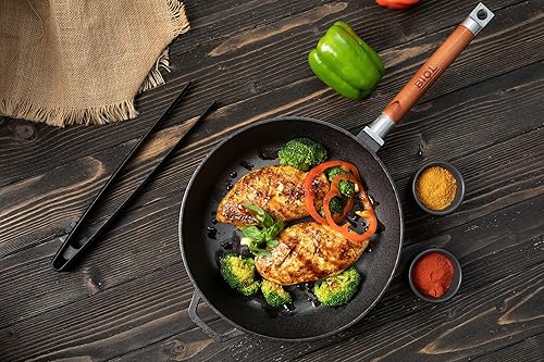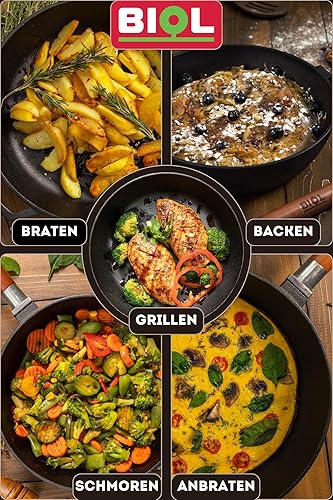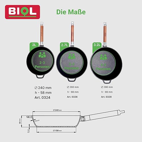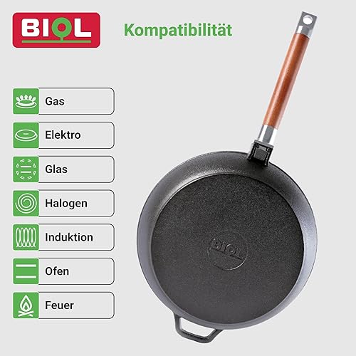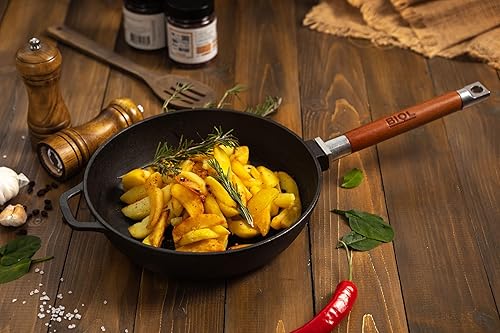 BIOL Poêle profonde en fonte avec manche en bois amovible de 24 cm pour induction, haute qualité, poêle universelle, rôtir, mijoter, cuisson facile