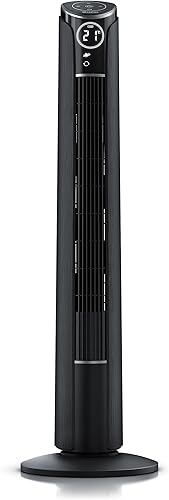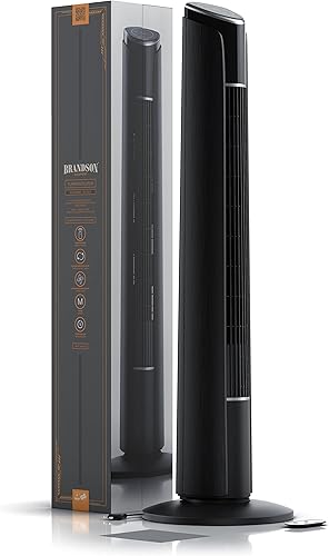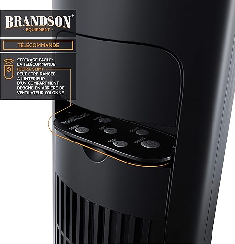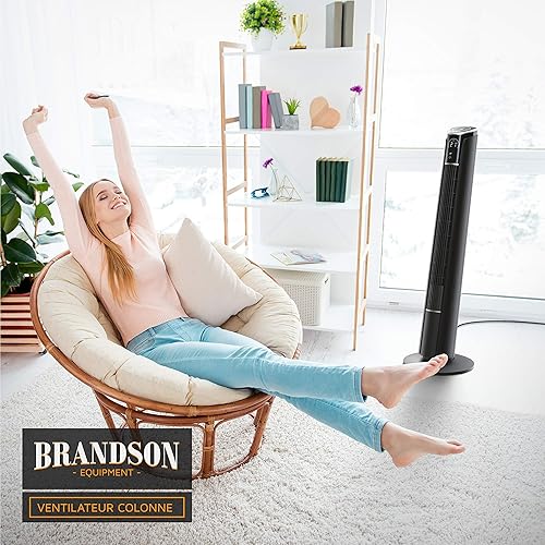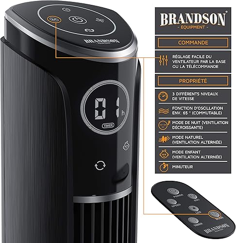 Brandson - Ventilateur Colonne avec télécommande 45W Silencieux Oscillant inclinable à 10°, Hauteur 108cm, 3 Vitesses, 4 Modes, Minuterie 12h, Oscillation 65°, Ecran LED, flux d'air puissant, Noir