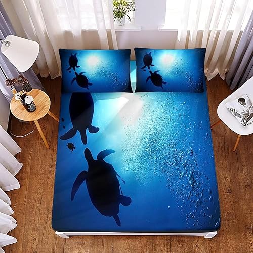 Drap Housse 120x190 Tortue de Mer, 3D Océan Bleu Drap-Housse 120 x 190, Drap Plat 1 Personne, Drap Housse Enfant avec 2 Taies d'oreillers pour Matelas Épais b2907