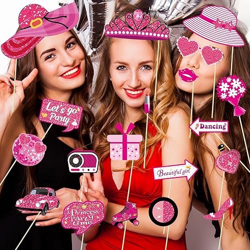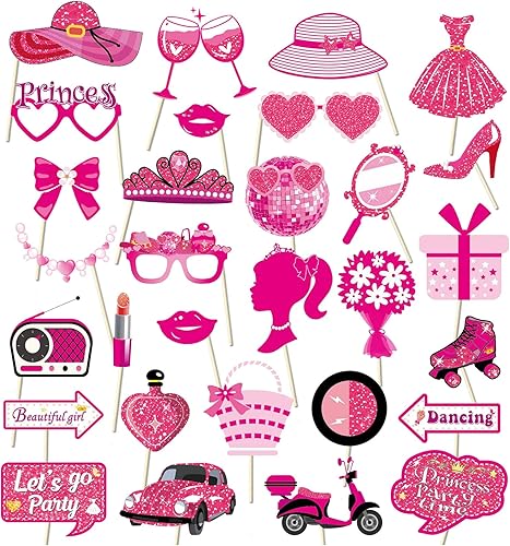 Lot de 30 accessoires pour photomaton de fête Barbie - Accessoires de fête d'anniversaire à paillettes pour filles - Rose vif