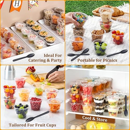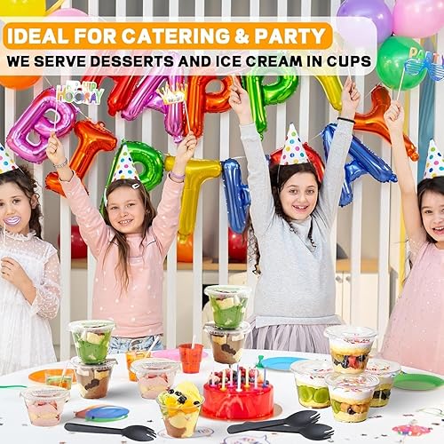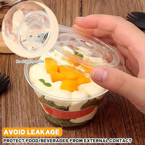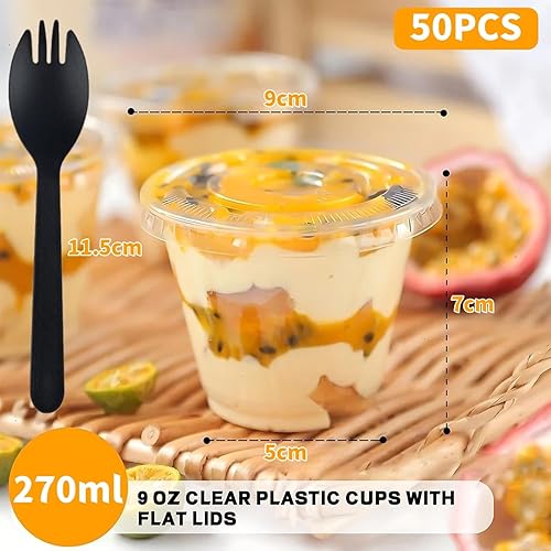 LATERN 50 Pièces Gobelets à Dessert en Plastique avec Couvercles, 270ml Rondes Coupes à Dessert Coupe Apéritif Parfait Clair Bol de Service Réutilisable avec Fourchettes pour Pudding Mousse Party
