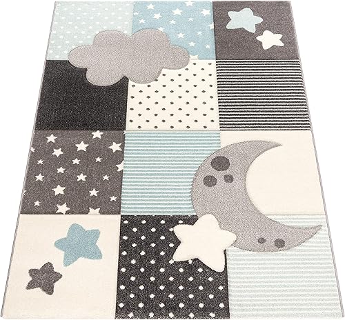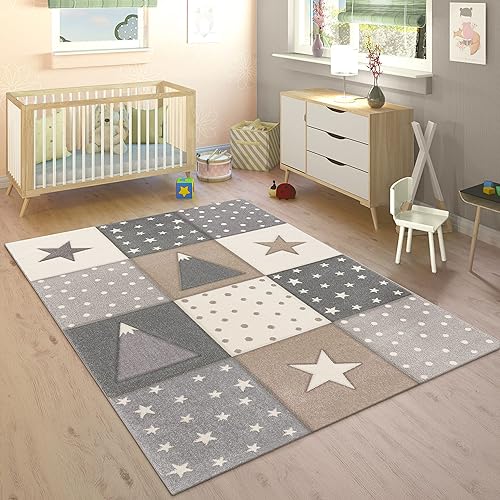 Paco Home Tapis Enfant Tapis Chambre Enfant Fille Garcon Pastel 3D Pois Etoile Beige Gris Crème, Dimension:140x200 cm