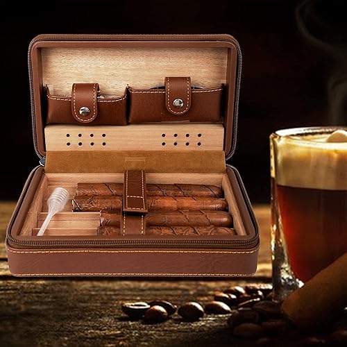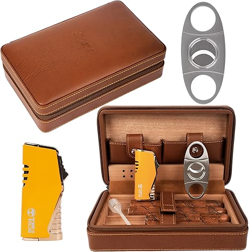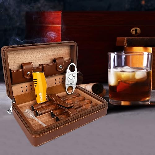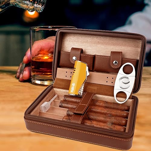 4 Doigts Cuir de voyage portable Étui à cigares, Coupe cigare, Cave à cigares avec Coupe cigare et Humidificateur, Cadeau de garçons d'honneur, Cadeau d'anniversaire, Cadeau fête des pères