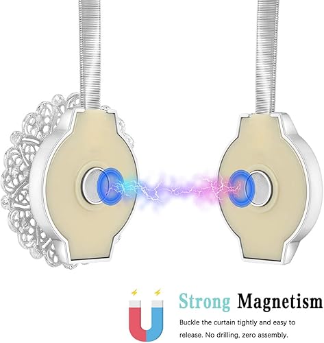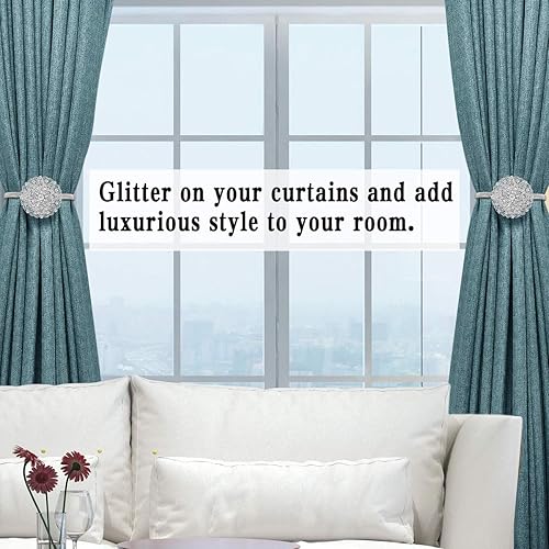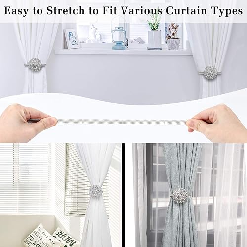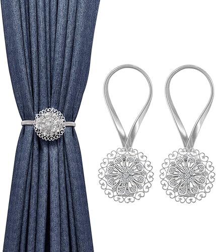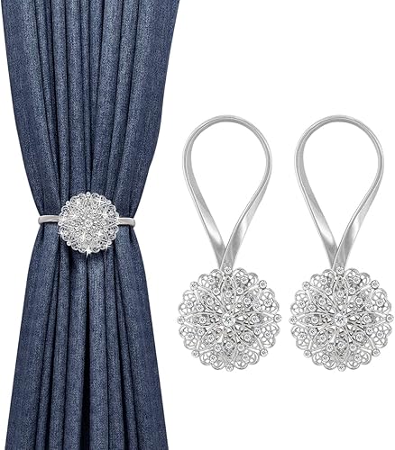 MoKo Embrasses à Rideaux avec Boucle Magnétique [Lot de 2], Boucles à Rideaux Élastiques, Clips de Fleur de Cristal, avec Fil à Ressort, Pas de Forage, Décoration pour Bureau Domicile - Argent