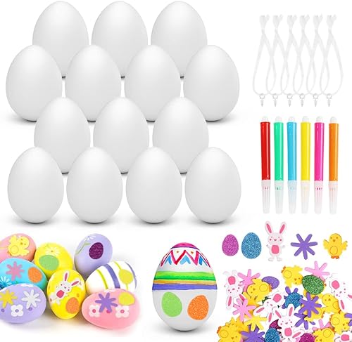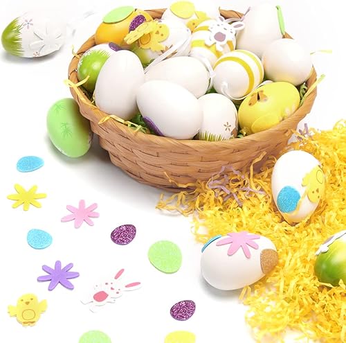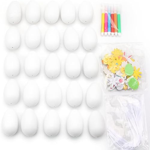 Wishstar 25 pcs Oeufs de Paques, Oeufs en Plastique Suspendus avec Corde,Peinture Oeuf de Paques,Livré avec 80 Autocollants de Pâques et 6 pinceaux colorés,Peinture de Bricolage de Paques