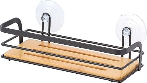 MSV Étagère de Douche sans perçage avec ventouses en Acier et Bambou Noir Mat 12 x 9 x 25,5 cm