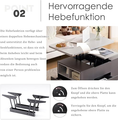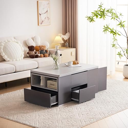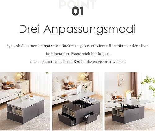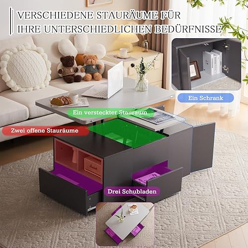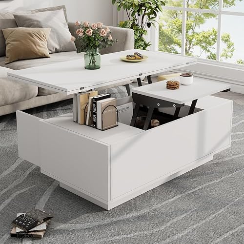 Seyakany Table Basse relevable multifonctionnelle,avec tiroirs,Le Plateau Peut être Ouvert pour Former 2 Tables,Grande capacité,Table Basse Salon Moderne (Blanc+Jaune-Brun)