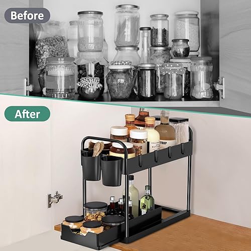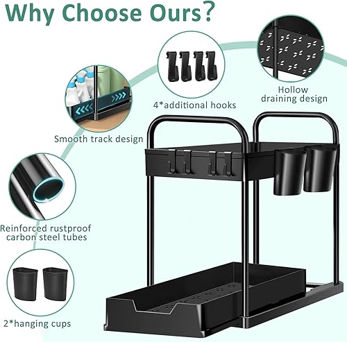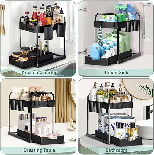 HABOWN Étagère sous Évier à 2 Niveaux, Organiseur de Cuisine avec 4 Crochets et 2 Gobelet Suspendu, Rangement Placard Organisation Salle de Bain Tiroir, Noir
