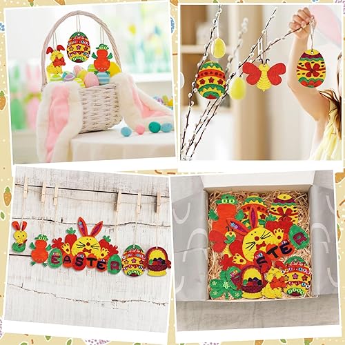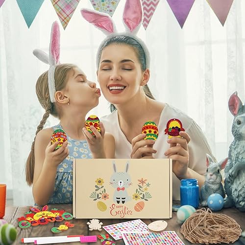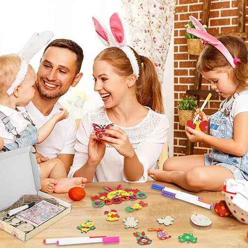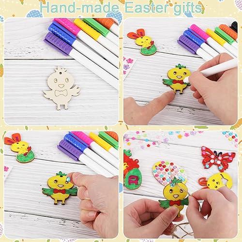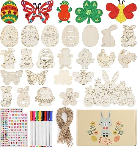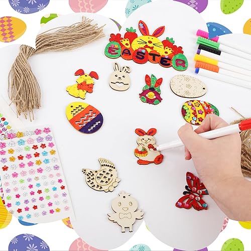 ANTROBIN Kit de bricolage de Pâques, pendentifs en bois pour peindre, bricoler Pâques, enfants - Œufs de Pâques - Lapin - Poulet - Fleur - Avec stylo aquarelle, corde, pinceau, cadeaux de Pâques pour