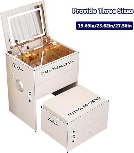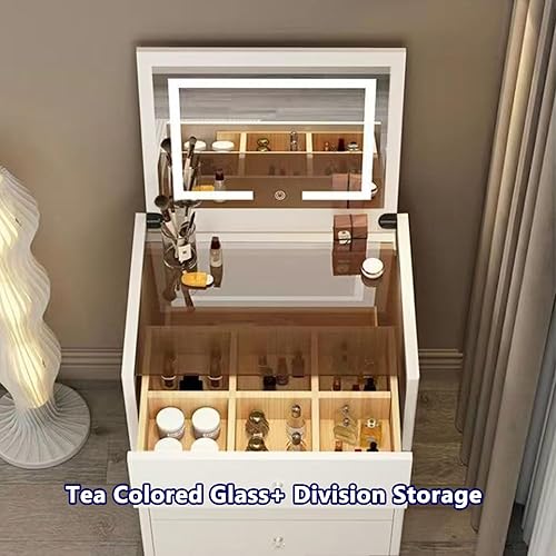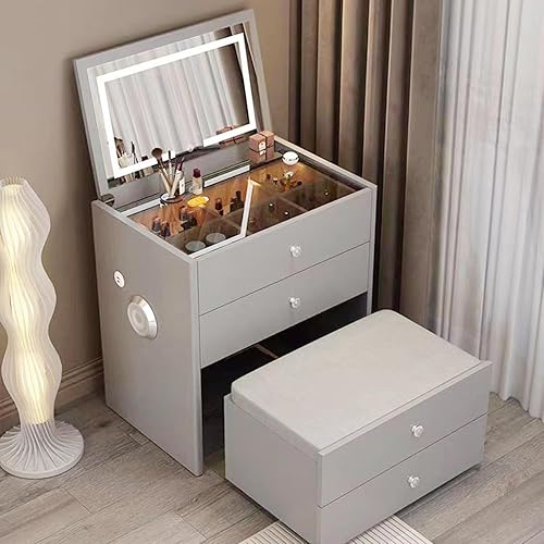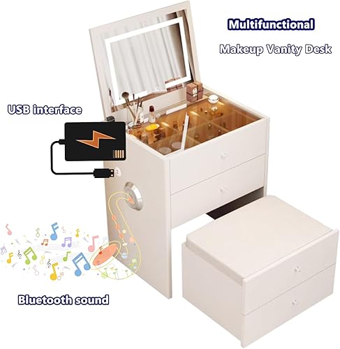 LBLFEBD Petit Bureau de Coiffeuse intégré avec Miroir, Meuble-lavabo Compact avec 4 tiroirs, Bureau Rabattable, Tabouret de Maquillage Doux, avec Prise USB et Deux Haut-parleurs
