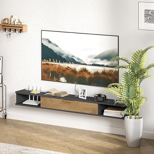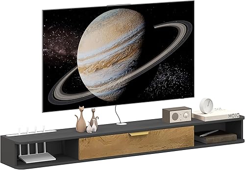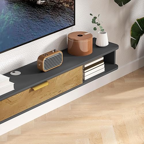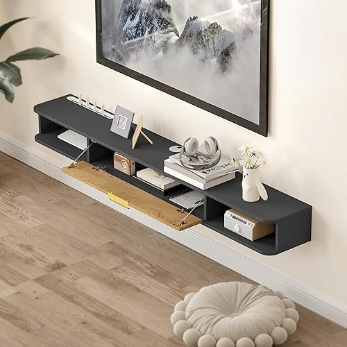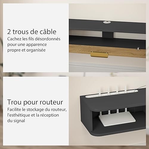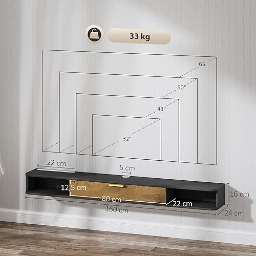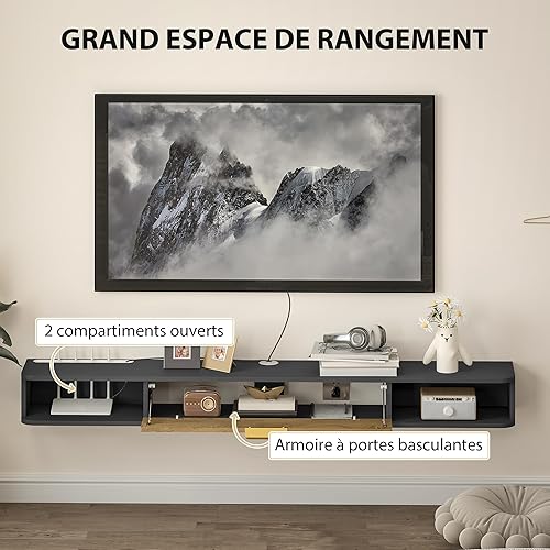 HOMCOM Meuble TV Suspendu Meuble télé Bois Banc TV Mural avec Compartiments Ouverts, Porte Rabattable et Passe-câbles, pour Salon Chambre à Coucher, 160 x 24 x 16 cm, Gris