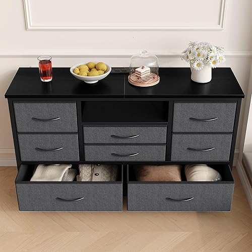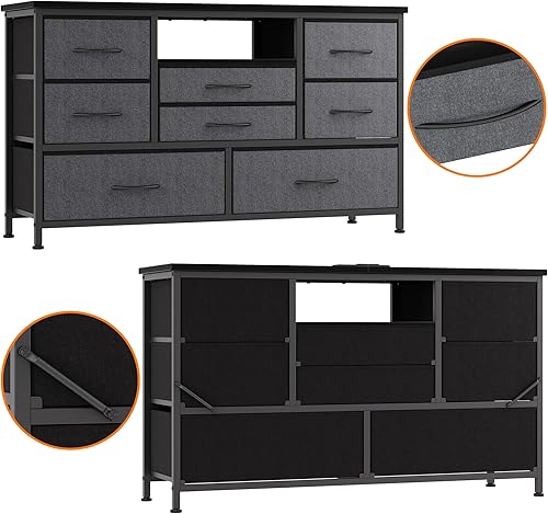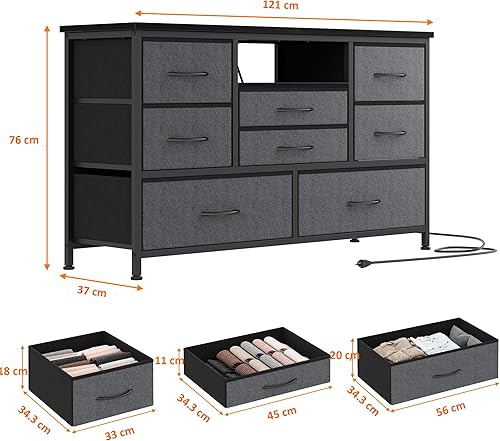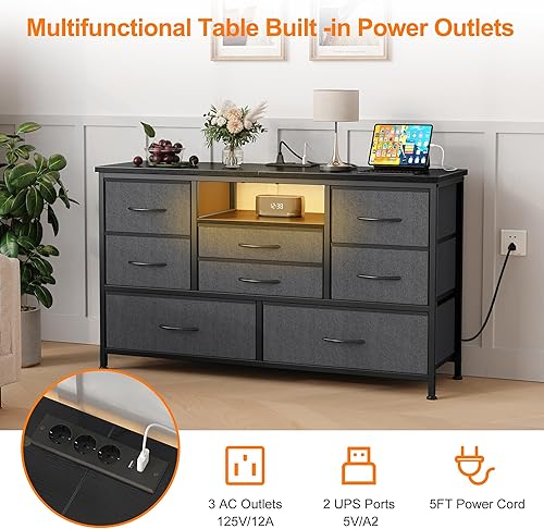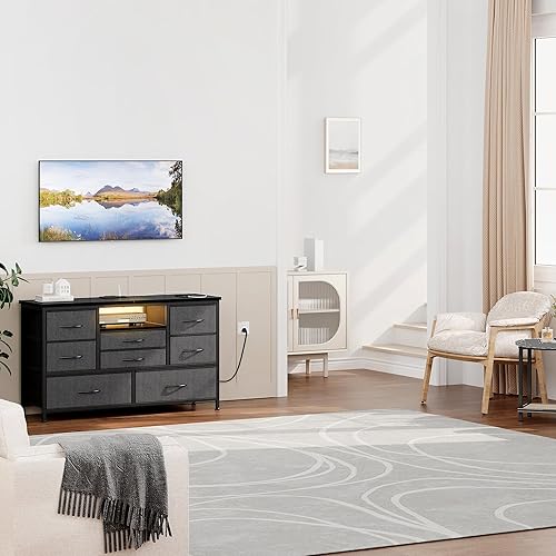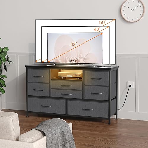 Baloveby Commode à 8 Tiroirs, Meuble TV avec Lumière LED, Station de Charge, Commode pour Chambre, Salon, Couloir avec Structure en Métal, Plateau de Table en Bois (Rose)