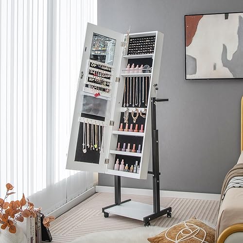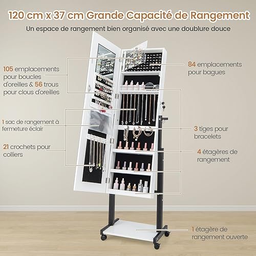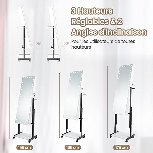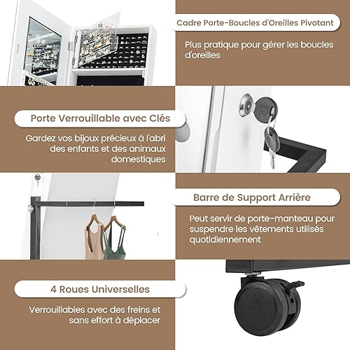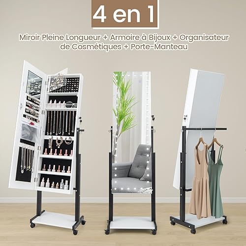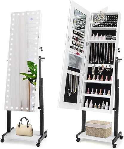 COSTWAY Armoire à Bijoux à Roulettes Hauteur Réglables, Miroir Pleine Longueur avec Lumières LED, Interrupteur Tactile, Verrouillable, Roues Universelles(Blanc)