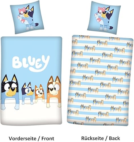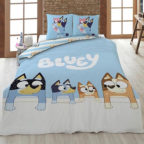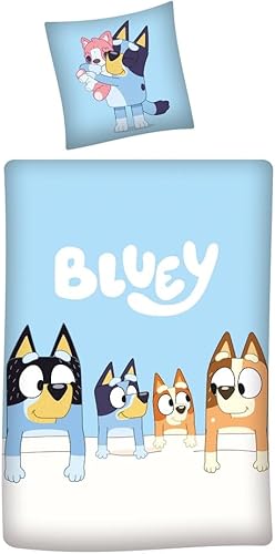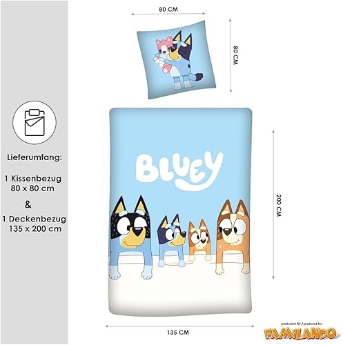 Familando Linge de lit Bluey 135x200 80x80 pour Enfants · Linge de lit Enfant Bleu en 100% Coton avec Fermeture éclair · Motif Bluey Family Bingo Bandit Chilli