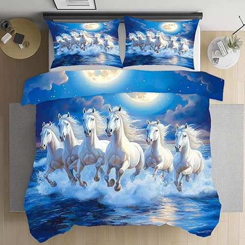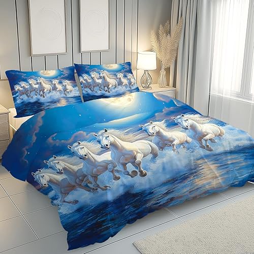 Housse de Couette Vagues Océan Cheval au Galop Housse de Couette 220x240 Fermeture Éclair, Animaux Botanique Prairie Parure de Lit avec 2 Taies d'oreiller Douce et Respirante