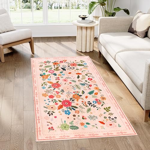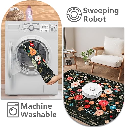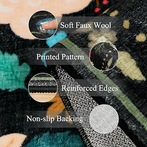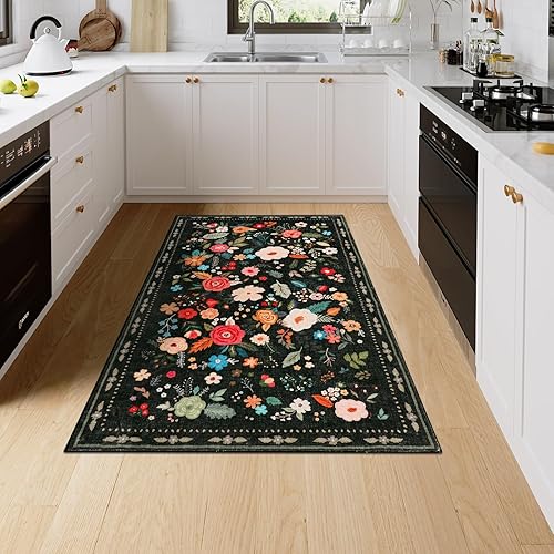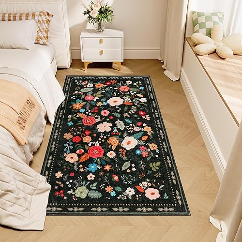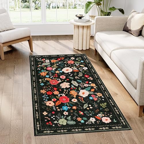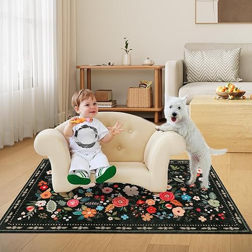 Homcomodar Tapis Salon Lavable 160x230cm Tapis Floral Noir pour Chambre de Fille - Poil Ras de Salle a Manger Crèche Salle de Jeux