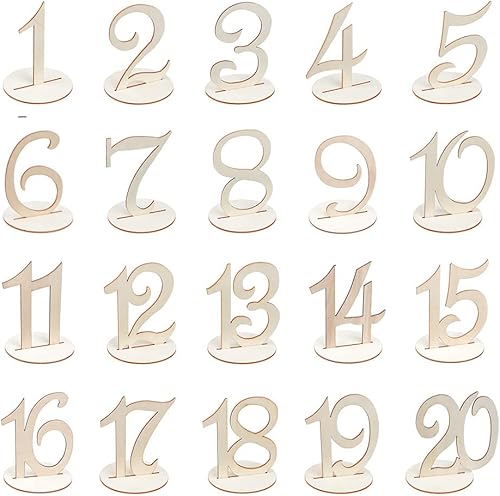FINGERINSPIRE 20PCS Numéros de Table en Bois avec Base de Support 10cm Haut Numéros en Bois 1-20 Numéro Forme Décoration de Table Numéros de Siège de Réception de Mariage pour Fête Banquet Événement